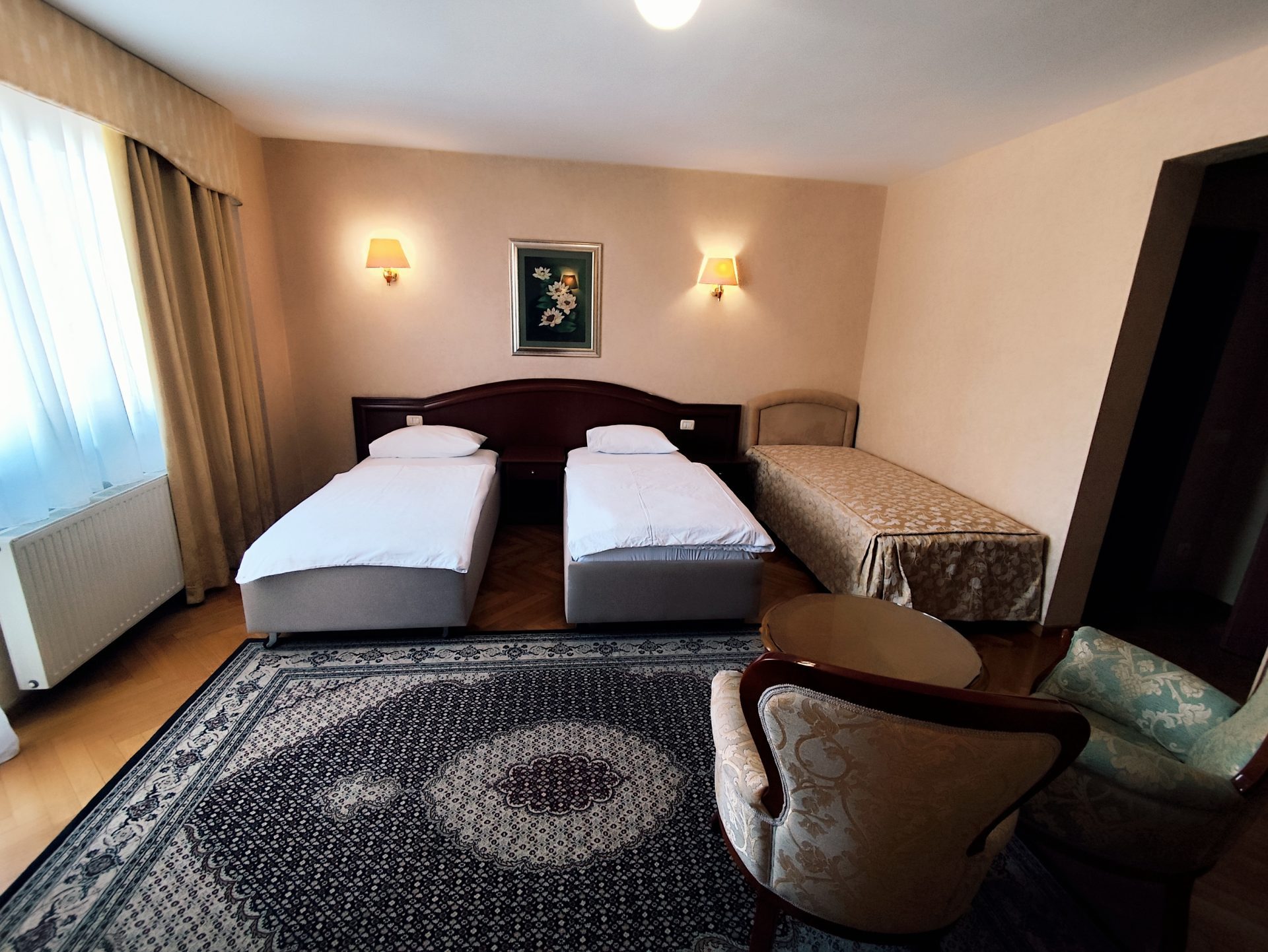 Trokrevetna soba s odvojenim krevetima, ispunjena svjetlom i toplim tonovima koji podsjećaju na cvat mimoze. Nudi prostran i udoban smještaj za obitelji ili manje grupe. Ova soba pruža osjećaj privatnosti, ali i domaće ugode, čineći boravak opuštajućim. Sve naše sobe uređene su s posebnom pažnjom prema detaljima, kako bi Vaš boravak bio što ugodniji. Svaka soba opremljena je udobnim krevetima, vlastitom kupaonicom, klima-uređajem, televizorom i besplatnim Wi-Fi internetom. Interijer odiše toplinom i elegancijom, a čistoća i udobnost su nam na prvom mjestu. Bilo da boravite kod nas poslovno, turistički ili u prolazu, sigurni smo da ćete se osjećati kao kod kuće.